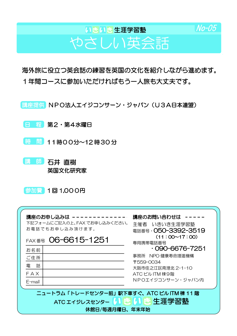 エイジコンサーン・ジャパンでは、U3A活動の一貫として、大阪南港ATC(アジア太平洋トレードセンター)及び、東大阪・日本パプテスト連盟 関西黎明キリスト教会内にてにて、U3Aいきいき生涯学習塾を開催しています。